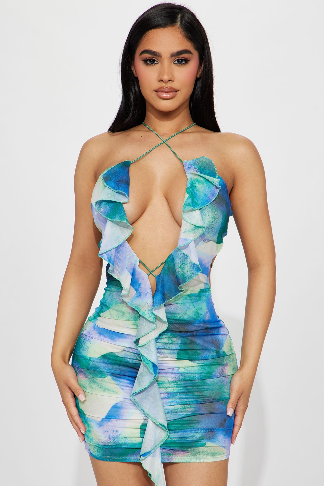 Ariel Mesh Ruched Mini Dress - Green/combo