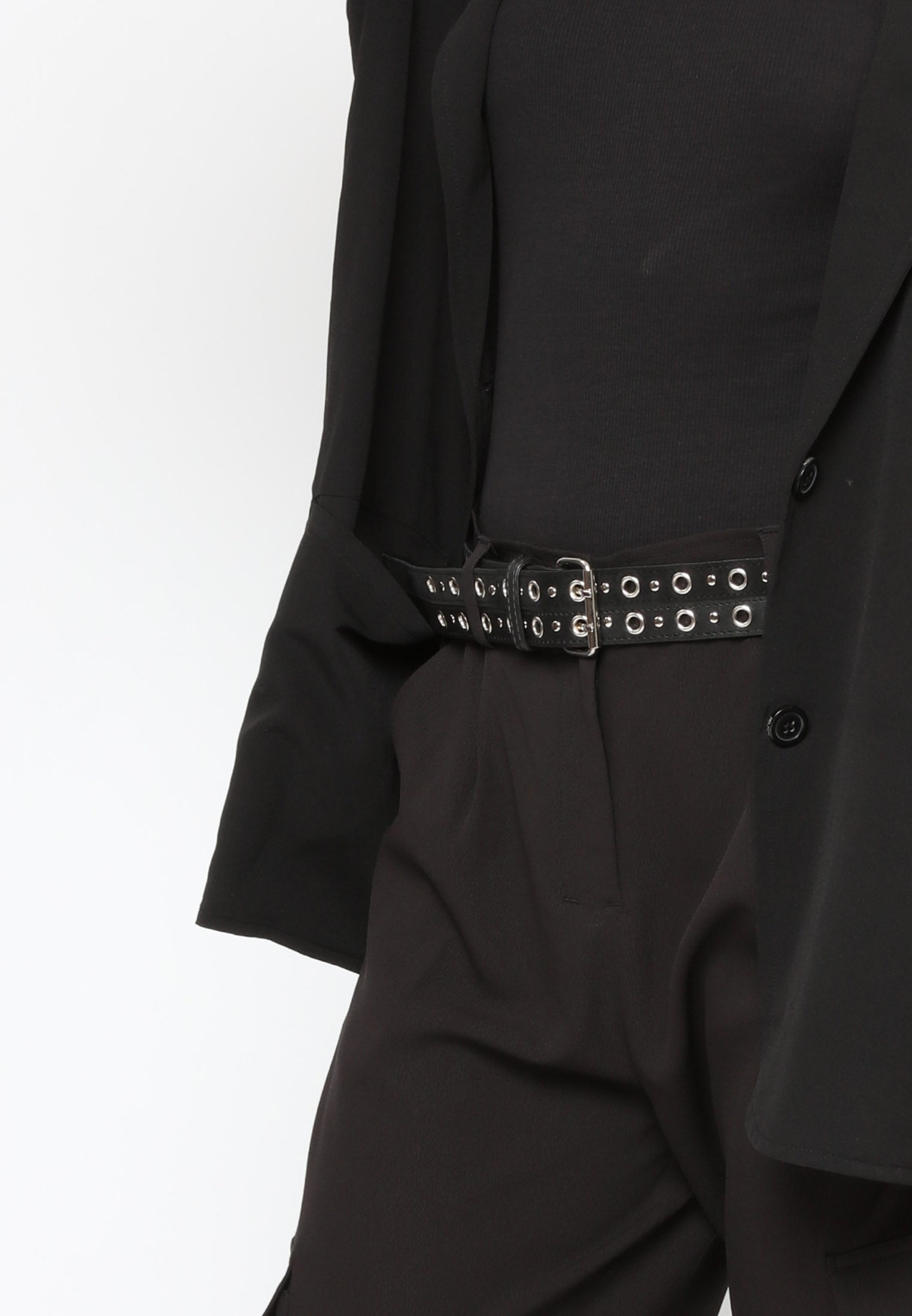 The Celestial belt in black is crafted from leather and suede featuring a double prong buckle and stud detailing that will elevate any look. With its all-over eyelet detailing, this belt will fit many sizes. Wear in the waist over your printed dress. Length: 108 cm including buckle, width 3.5 cm.t.