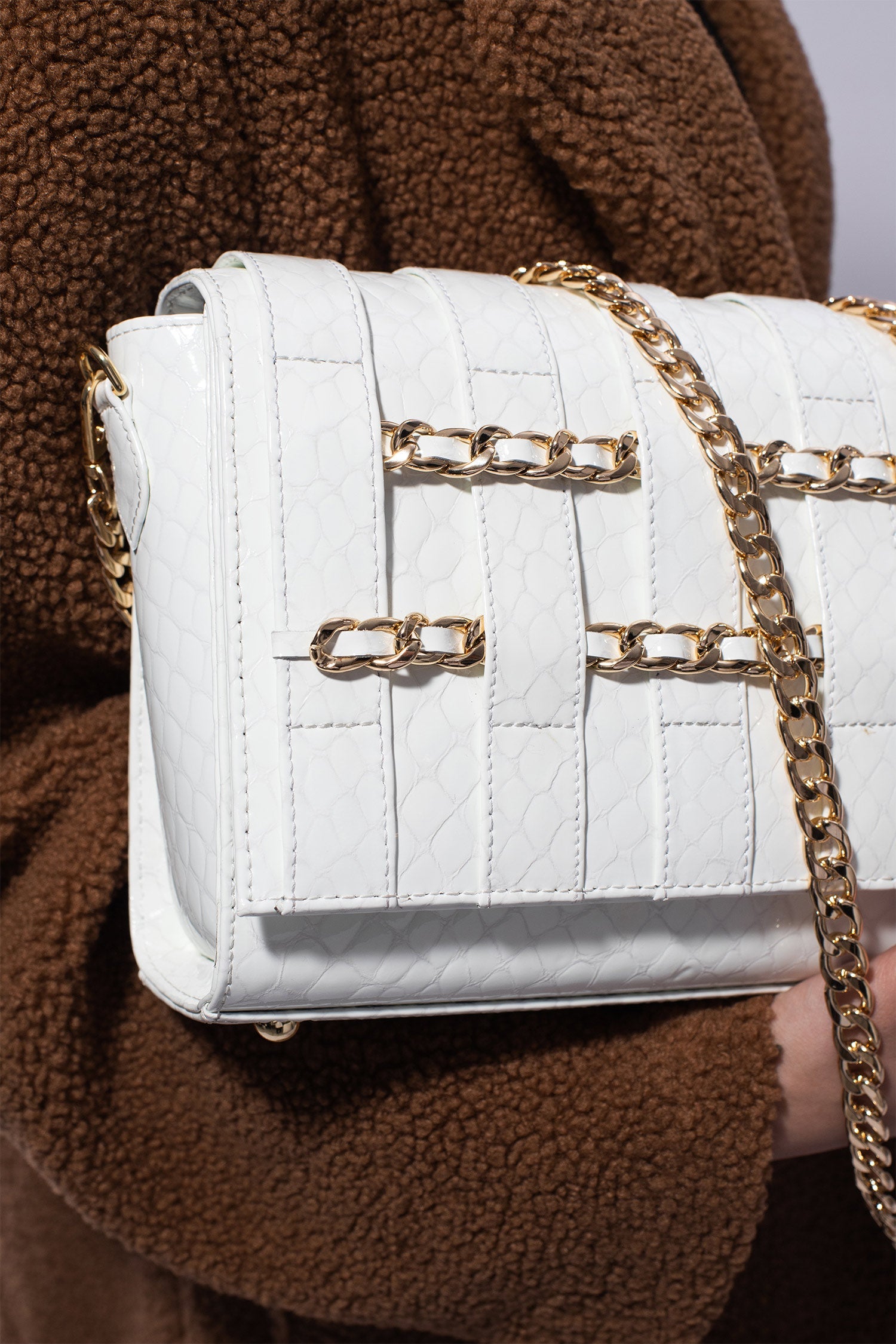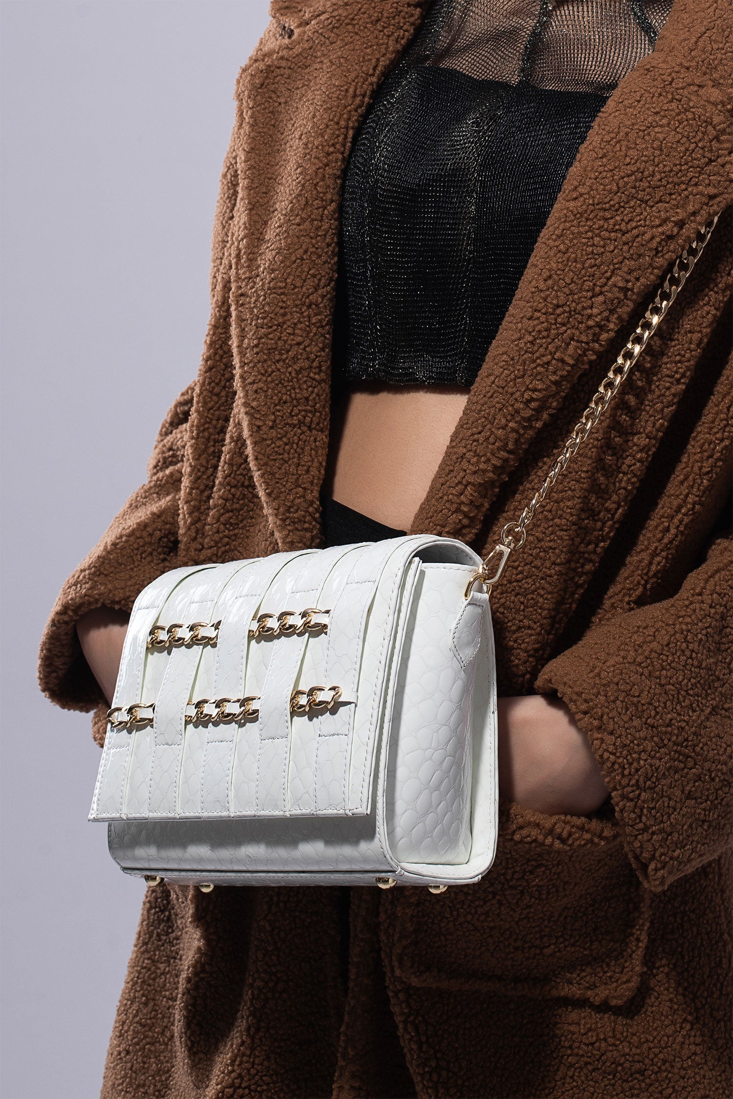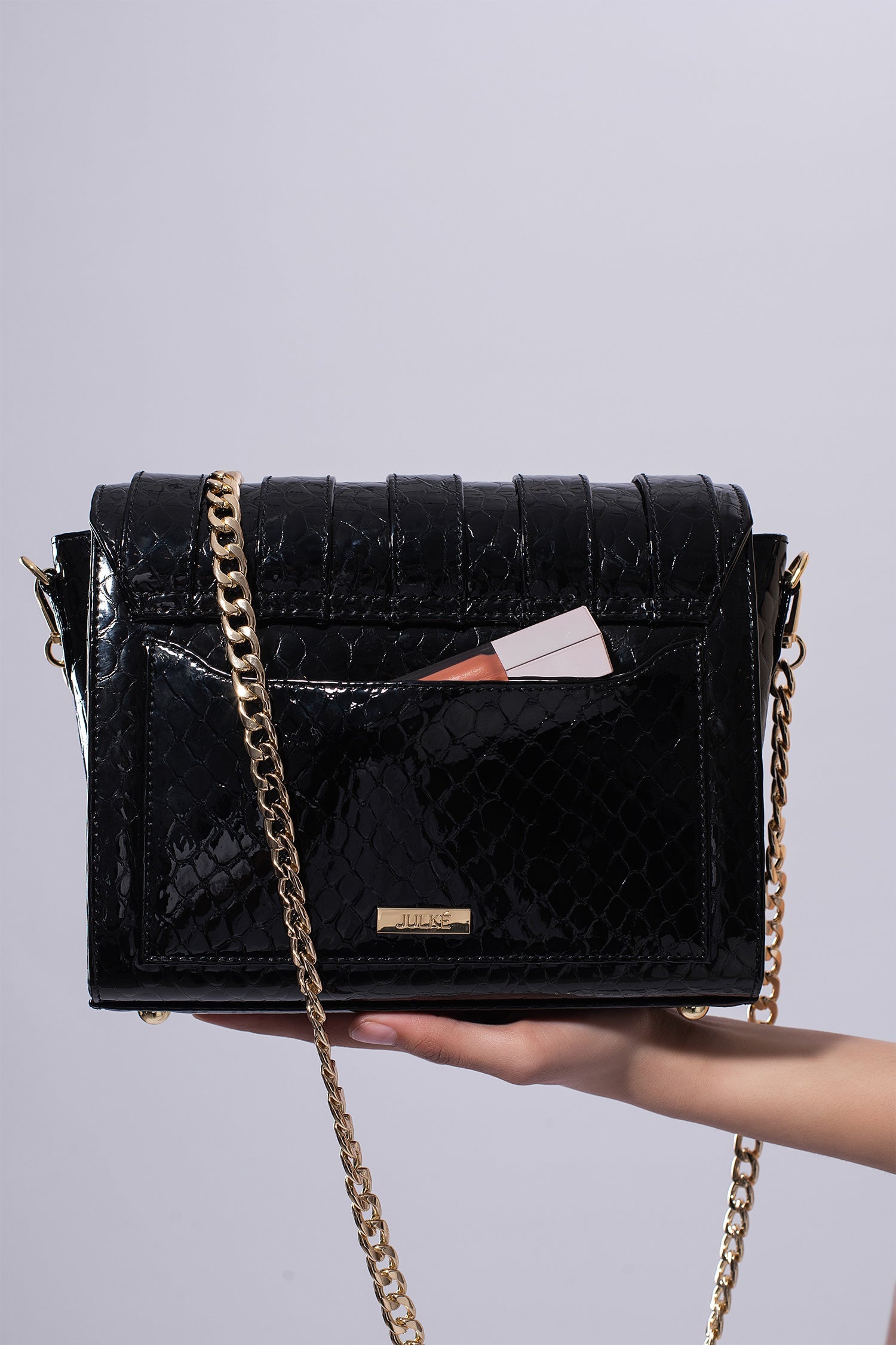 A shoulder bag exuding Tech-Age vibes with interwoven gold chains and croc-textured leather, JULKÉ'S Cipher is urban chic to the core. The classic, and convenient recangular silhouette houses enough open space to stash your essentials - and more - on the go.