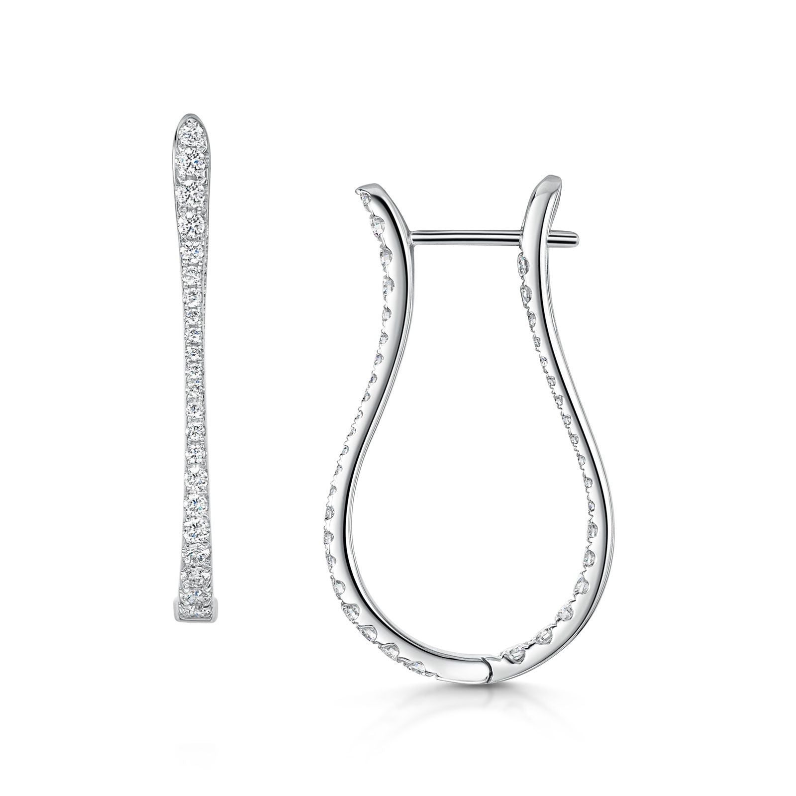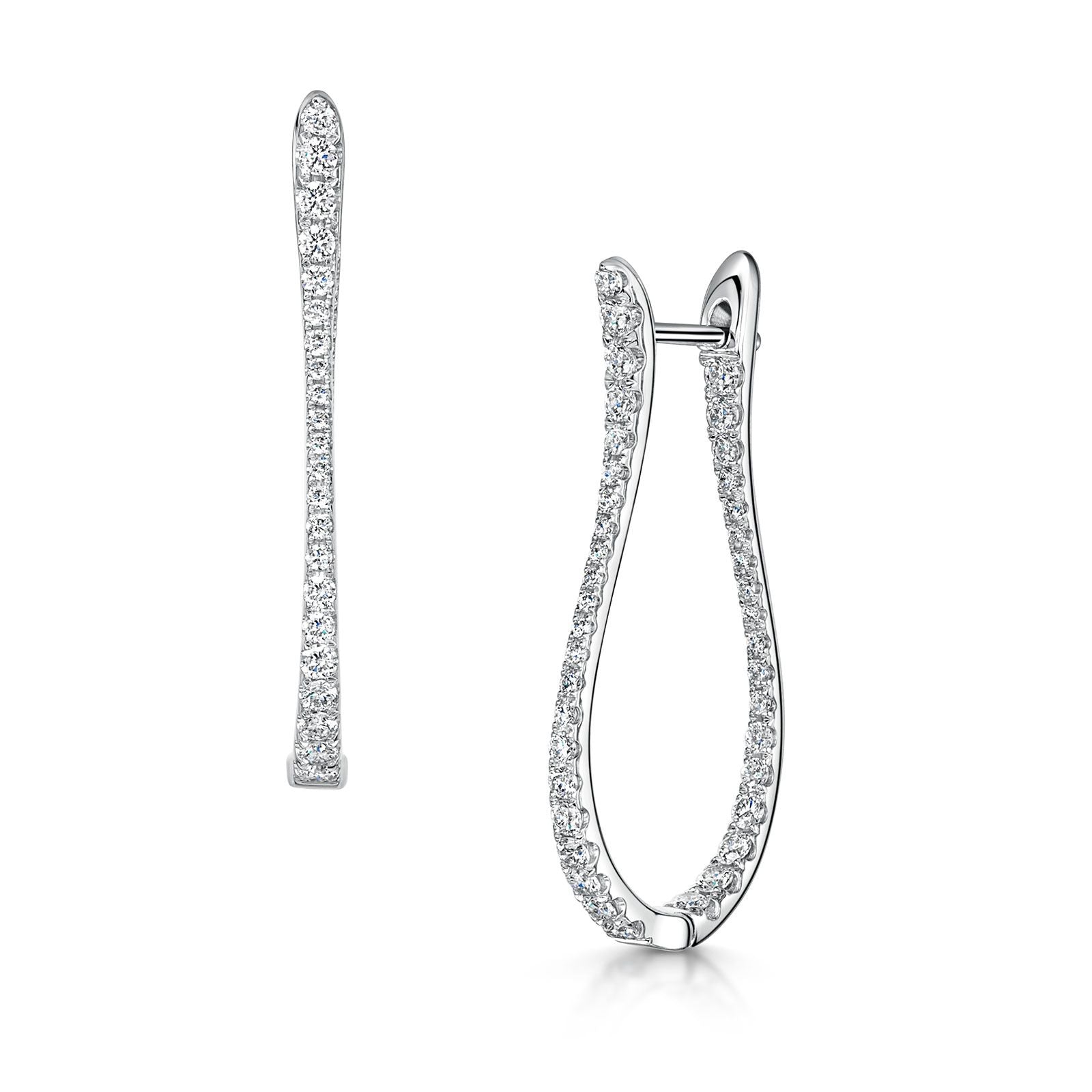 Crafted from 18ct white gold, these long hoop earrings boast a horseshoe profile encrusted with mesmerising G/H VS Brilliant-cut diamonds in a micro claw setting. Totalling 0.96ct, these glistening white diamonds cascade along the front sections of these luxurious earrings, creating an alluring and glamorous effect. Also available in 18ct yellow gold (ref: 0310245).